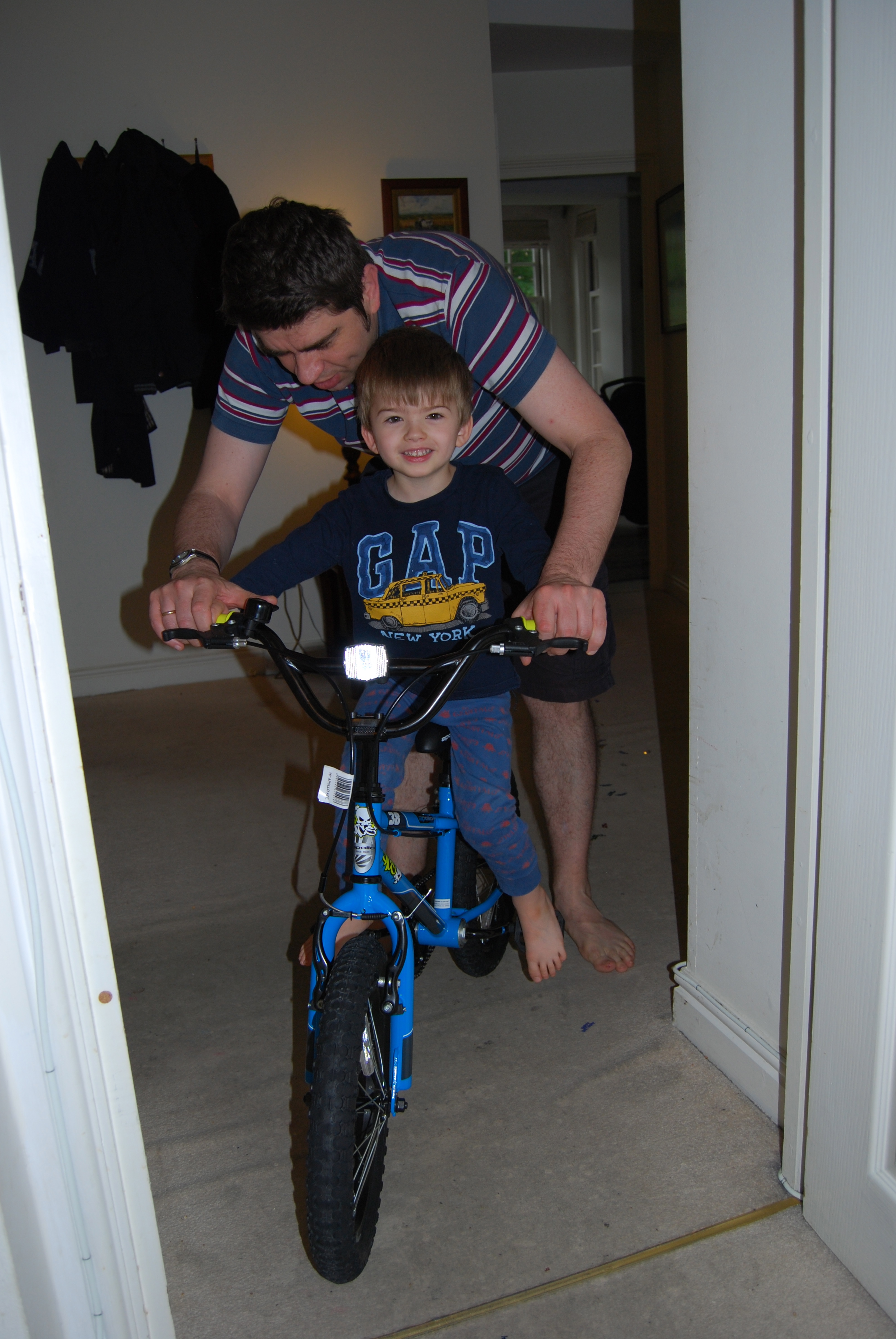 ….where his presents were waiting, including THE present from Mummy and Daddy, his first bike!