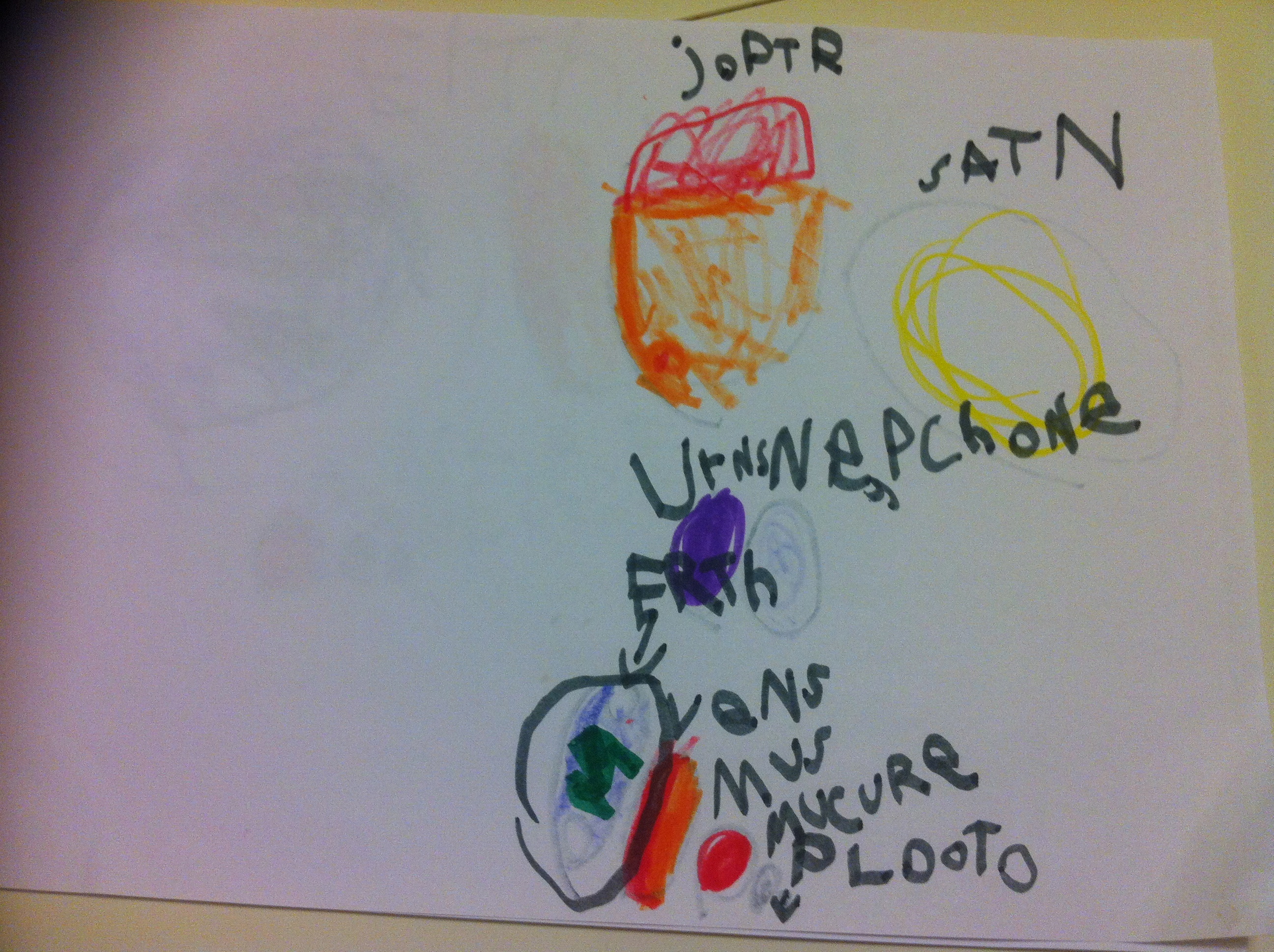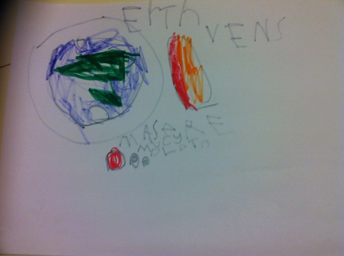 Anyway, I should have paid more attention to this particular video because here’s what I found when I came downstairs from bathing Lucian last night… Gabs had drawn the “Earth is Invisible” video frame by frame, sounding out the names himself and missing out most of the vowels in the process, but I knew what he meant and he showed me Oh, so proudly which order they went in…