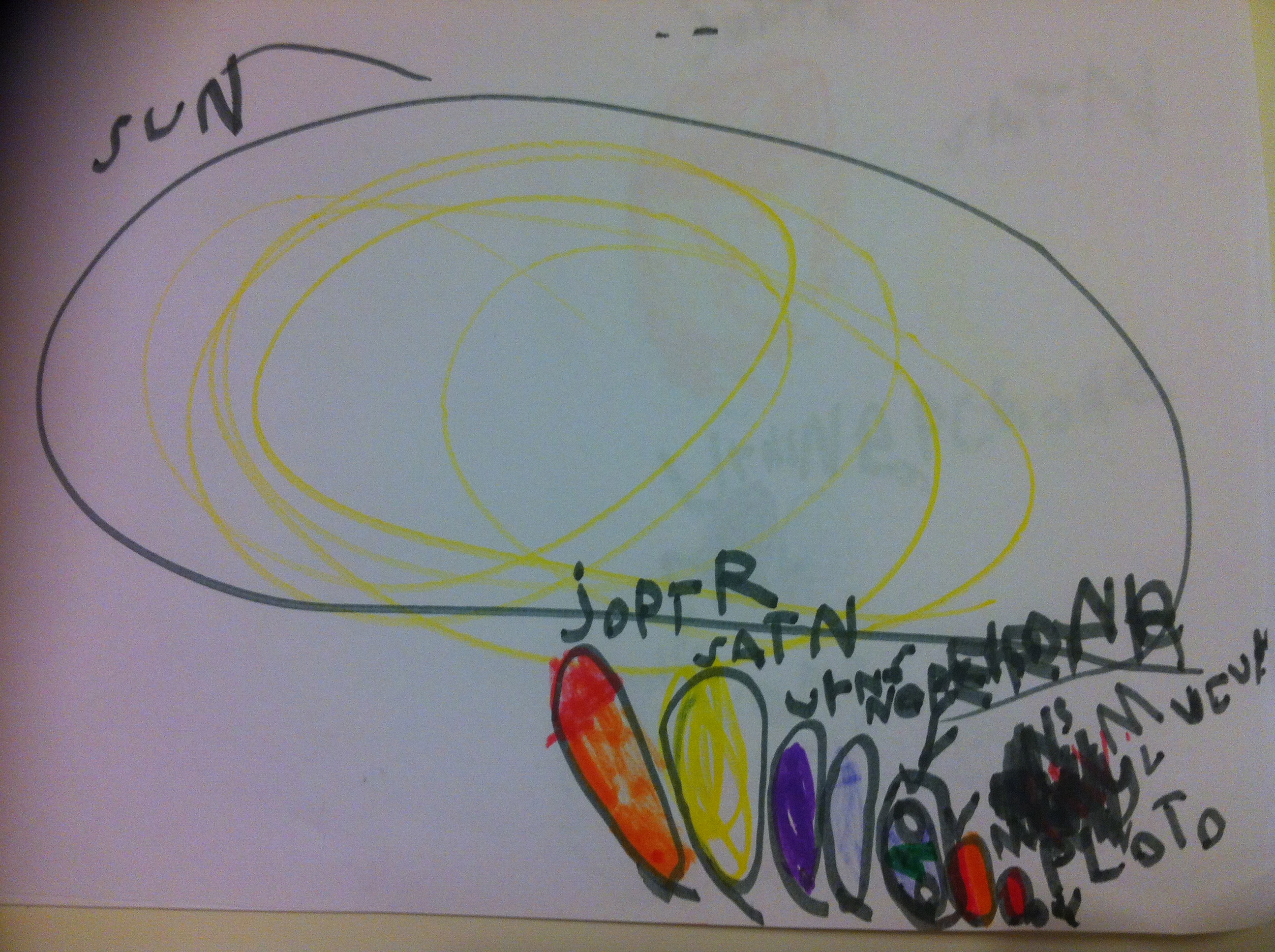 Those of you who follow my blog will already know about my – probably Aspergers – four year old, Gabriel and his gigantic obsession with astronomy, planets, stars, anything vaguely space related. But specifically our Solar System and the order of the planets and the sizes of the stars, from ours right up to the biggest known stars in our Universe. In fact, the only way they are managing him at school currently is to allow him to draw and label the solar system over and over for half the day while we’re waiting for him to be “statemented” and they can get an extra person in the classroom for him. He then comes home and does exactly the same thing for around two hours after school. Oh, and did I mention every second of every day that he’s awake he’s is talking at us, constantly telling us facts like “Mummmeeee? Pluto’s orbit crosses Neptune’s… Dadddeeeee? VY Canis Majoris is a red hypergiant… Riegel is a blue supergiant, Titan is yellow, did you know our Sun has hydrogen and helium?” He barely stops to draw breath from one end of the day to another and it is exhausting to listen to but we kind of love it. He is so completely passionate and his little face lights up with glee reminding us of those crazy super-animated physicists talking on the History channel’s ‘The Universe‘ programmes who we find really sweet! “Obsessed” doesn’t quite cover it.