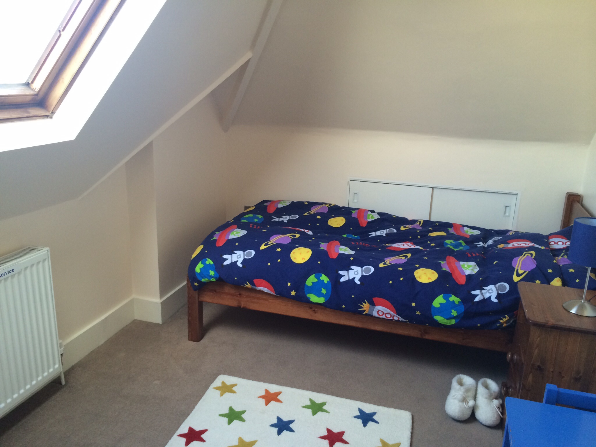 One day while I was out working with the BBC Concert Orchestra and then at acting class, Remus was looking after the kids and planned to paint the room, if they let him (nice warm magnolia instead of the horrible old graying off-white.) He thought he’d only have time to tape up the skirting boards etc. and maybe one coat if he was lucky, but in reality he ploughed through and completed the whole lot. It was super quick-drying paint so, somehow forgetting I really, really wanted to be there for this bit he went ahead and moved the bed up there, with the kids helping him carry every slat up the stairs, super-excited and jumping up and down around him as he worked.