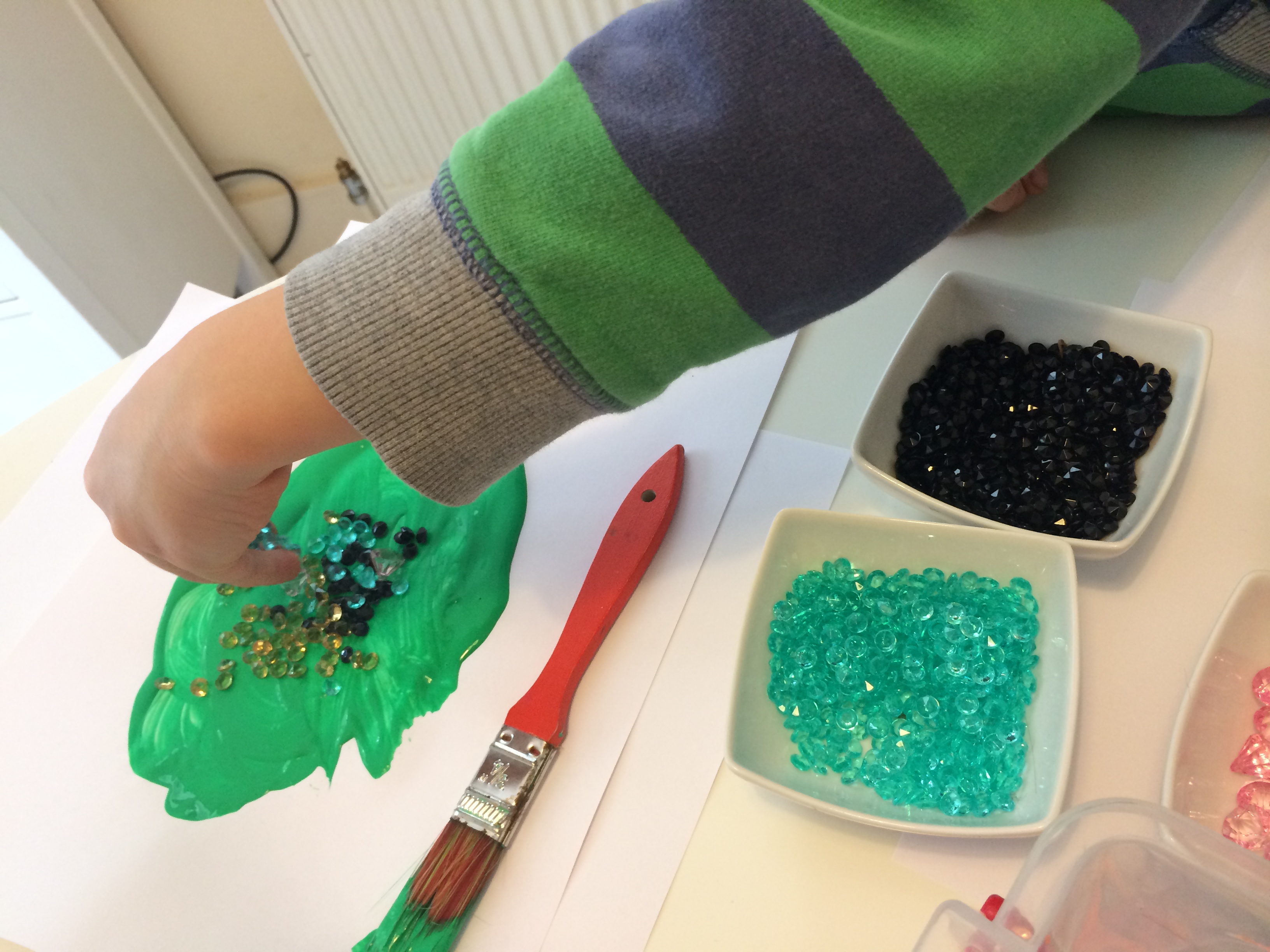 It’s been a long time since I’ve posted a Messy Play for Matilda Mae activity – and just as long since we’ve done one! Today, with two weeks left of the “Summer” holidays and flagging slightly on this grey day, we’re indoors painting and gluing, using up the left over gems from the crafting table at Gabi’s Minecraft Birthday Party.